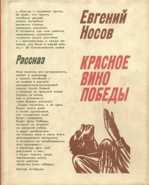 «Красное вино победы» история, которая может рассматриваться как документ, свидетельство очевидца. «У каждого солдата, уцелевшего и вернувшегося домой, свой День Победы. У меня вот такой, какой я написал в рассказе. Там ничего не добавлено, не придумано, написано именно так, как было в действительности» – писал Евгений Носов. Неудивительно, что талантливый писатель сумел так запечатлеть этот незабываемый праздник, чтобы над рассказом «Красное вино победы», плакали не только люди пережившие войну, но и их внуки, и правнуки.