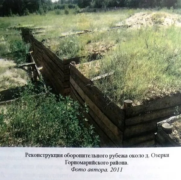 Каждому из военно-полевых строительств – и Звениговскому, и Горномарийскому – посвящены отдельные главы. Приводятся данные о рабочей силе: привлечены были колхозники, в качестве технического персонала – студенты ПЛТИ (но им не хватало знаний). Интересны фотографии работников, их личные воспоминания. Много документов о снабжении продовольствием, из чего следует, что норма выдачи хлеба однажды составила 270 г. в день на человека. Опубликованы современные фото окопов и других сохранившихся сооружений возле д. Торганово Звениговского района. А в Горномарийском районе в 2009 году появился своеобразный памятник труженикам тыла. Остатки окопов и траншей заросли лесом, и школьники Озеркинской средней школы сделали реконструкцию оборонительного рубежа. Ребята построили две ветки окопов, блиндаж, ДЗОТ и другие сооружения. О. А. Кошкина побывала на месте, сделала фото и опубликовала их.