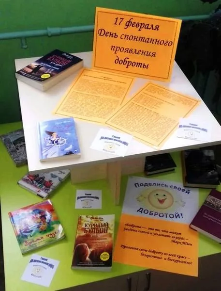 17 февраля в день Спонтанного проявления Доброты, сотрудники библиотеки-филиала №28 провели, ставшую традиционной, акцию «Поделиться добротой». В этот день, мы стремимся передать частичку нашей доброты читателям, говоря с ними о существующем празднике. Посетители взрослого абонемента получили возможность ознакомиться с выставкой, на которой была представлена информация о празднике и подборка литературы соответствующей тематики. Все выбранные книги, по мнению библиотекарей, создают хорошее настроение и несут в себе добрые чувства.
