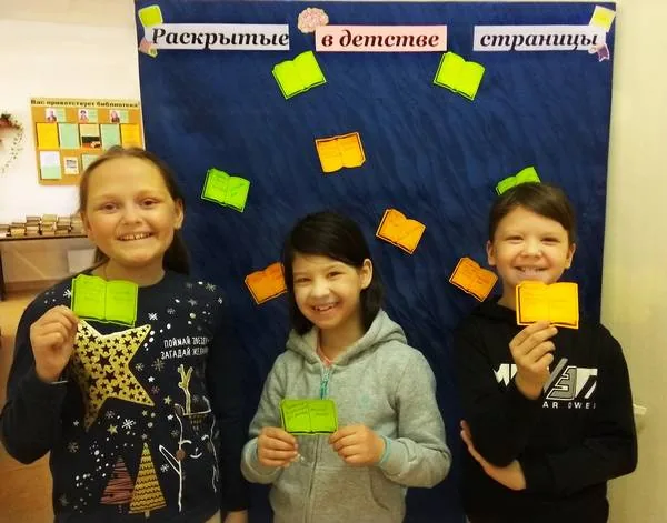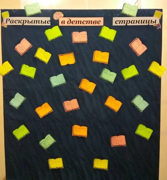 Детям предлагалось вспомнить свою любимую книгу, написать автора и название на красочном шаблоне в виде раскрытой книги и прикрепить на стенд с одноименным названием. Учащиеся старших классов записывали названия любимых книг детства.
