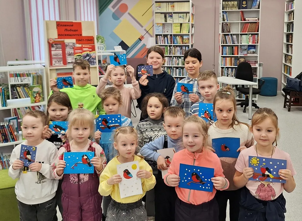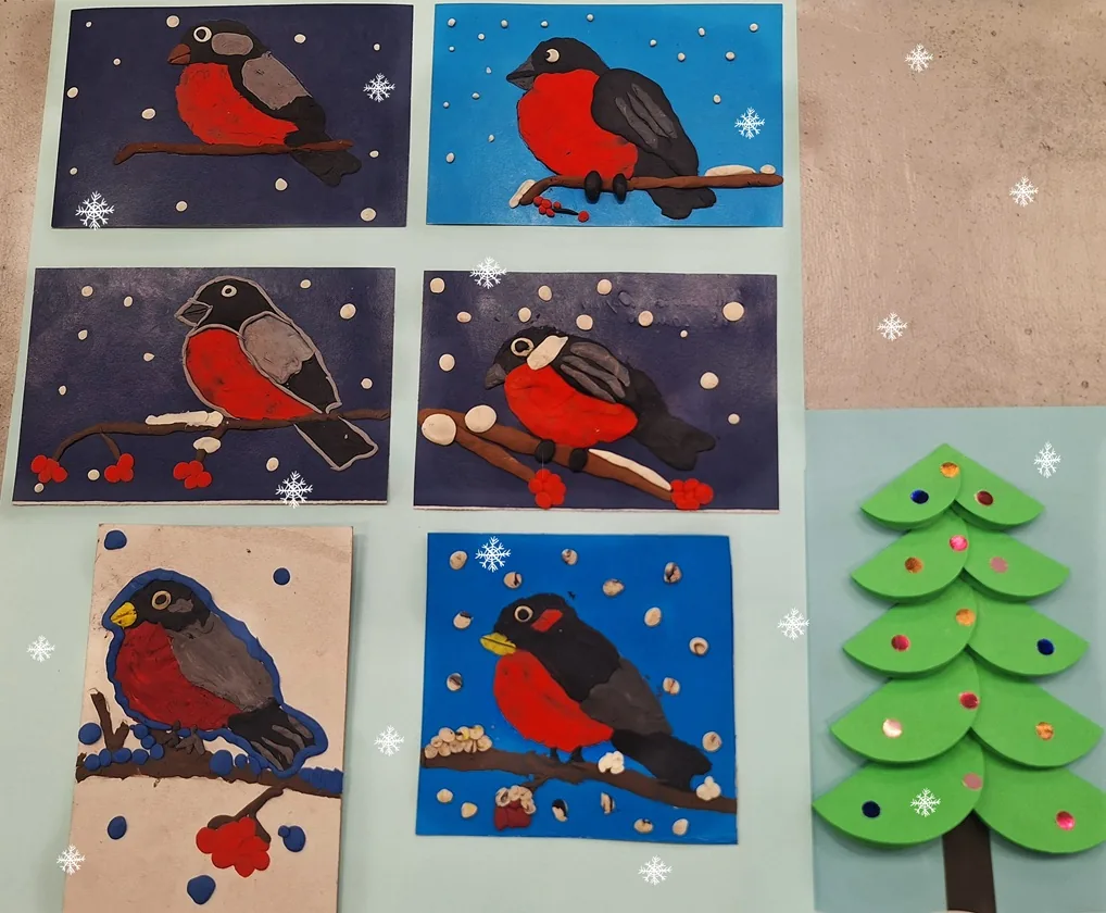 Библиотекарь кратко рассказала об интересных фактах из жизни снегирей, ребята отгадывали загадки. Затем библиотекарь рассказала ребятам о последовательности выполнения задания. Для образца были представлены картины из пластилина «Снегири» на интерактивной панели «Россия».