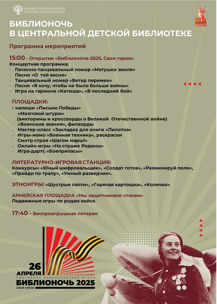 26 апреля 2025 года в модельной Центральной детской библиотеке состоится Всероссийская просветительская акция «Библионочь», которая будет посвящена Году защитника Отечества и 80-летию Великой Победы. Основная тема этого года — «Свои Герои», девиз акции: «Нет в России семьи такой, где б не памятен был свой Герой».
