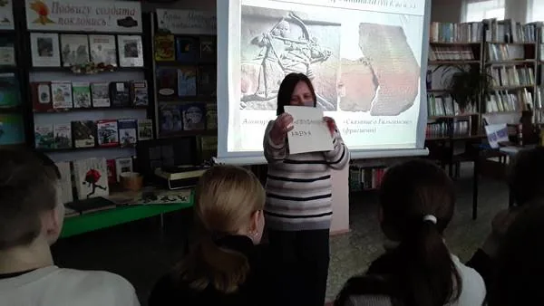 Беседа сопровождалась электронной презентацией и началась с рассказа о знаменитых библиотеках древности. Учащиеся узнали о драгоценных клинописных табличках из библиотеки Ашшурбанипала, о запрете на вывоз папируса из Египта из-за соперничества Александрийской и Пергамской библиотек, а также о том, что идею создания бумаги китайский сановник Цай Лунь позаимствовал у бумажных ос. Некоторые из писчих материалов (папирус, береста), были продемонстрированы вживую.