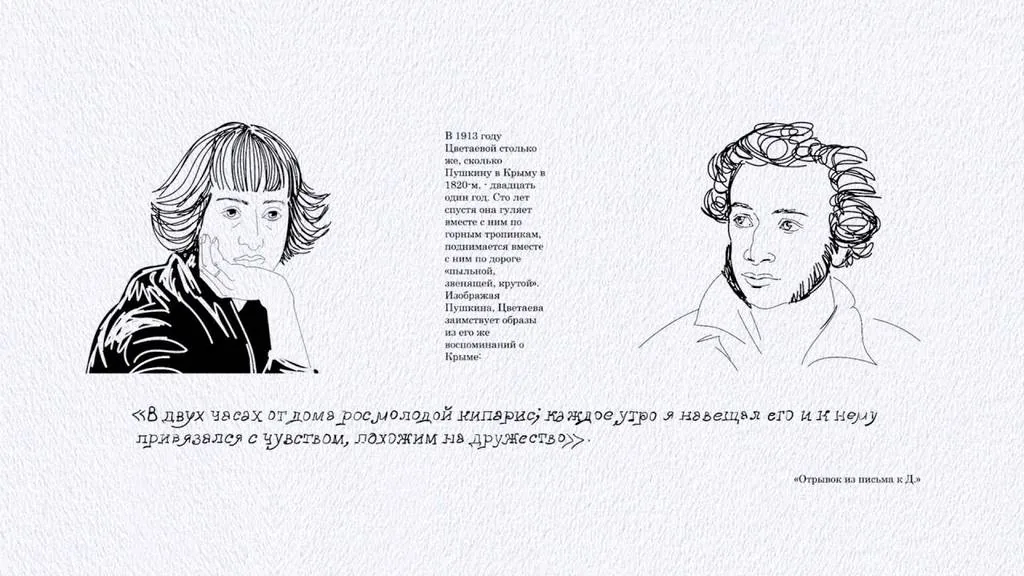 Памятник Пушкина был ключевой фигурой ее детства, он был целью ежедневных прогулок Муси. «Мне нравилось, что уходим мы или приходим, а он всегда стоит. Под снегом, под летящими листьями, в заре, в синеве, в мутном молоке зимы - всегда стоит…».