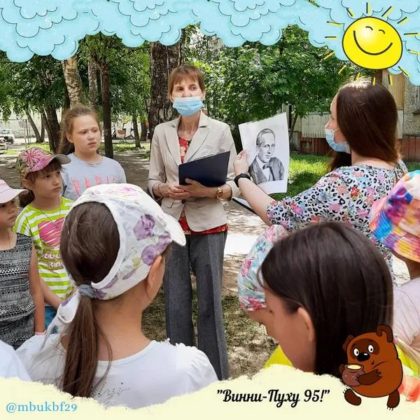 В 2021 году сказочная повесть Алана Милна «Винни-Пух и все-все-все» празднует свой юбилей – 95 лет со дня написания. В игровой форме сотрудники библиотеки познакомили детей с творчеством британского писателя Алана Милна, в частности с самым популярным его произведением о добром весёлом мишке. Ребята вспомнили о главных героях повести: Кристофере Робине, Винни-Пухе, Пятачке, ослике Иа и других.