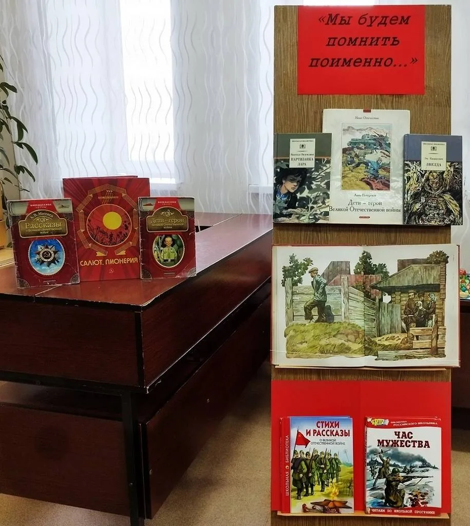 Библиотекарь ознакомила ребят с подборкой книг о юных героях войны на выставке, рассказала детям о совершенных ими подвигах и в завершении мероприятия ребята просмотрели презентацию о них «Нам память о них дорога бесконечно…».
