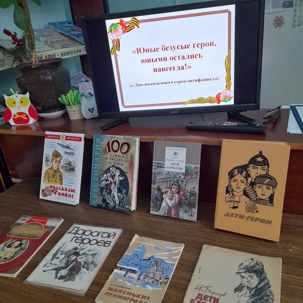 Мероприятие сопровождалось презентацией. О детях-героях войны была оформлена книжная выставка.