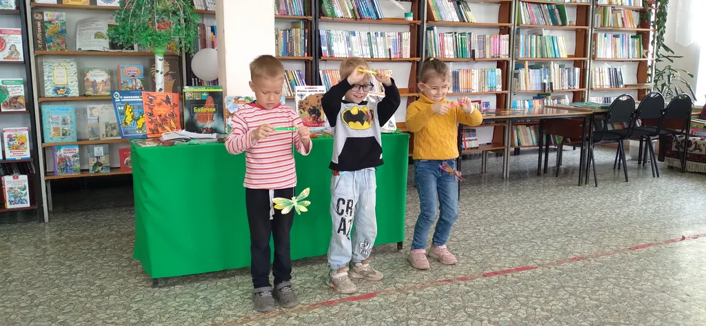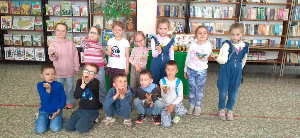 В читальном зале библиотеки детей встретила Кикимора болотная и предложила детям отправиться в небольшое путешествие в удивительный мир насекомых, в котором они узнают много нового и интересного. Кикимора рассказала ребятам о том, где обитают насекомые, чем питаются, как можно определить, что перед нами именно насекомое. Затем познакомила детей со стрекозой, кузнечиком, бабочкой, божьей коровкой, пчелой. Прежде чем познакомить ребят с одним из представителей насекомых, Кикимора загадывала о нем загадку, а затем, рассказав о насекомом, проводила с детьми различные игры и упражнения: игру – моталочку «Стрекоза и палочка», физкультминутку «Как зеленые пружинки мы попрыгаем с тобой», танцевальную минутку «Найди для бабочки цветок», дыхательную гимнастику «Божья коровка», игру – соревнование «Похлопочем над цветком и поделимся медком».