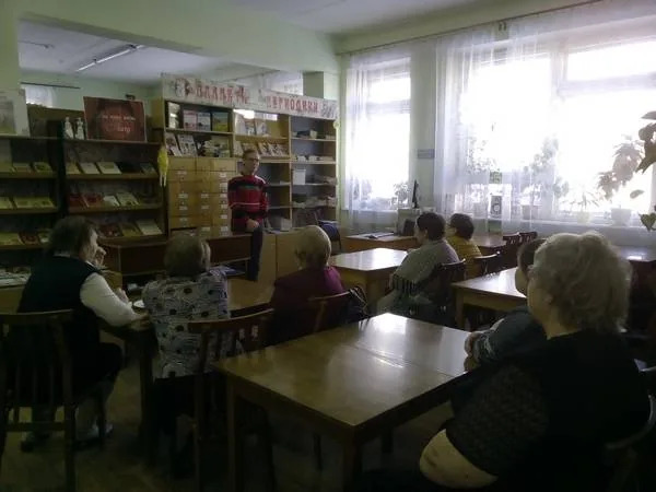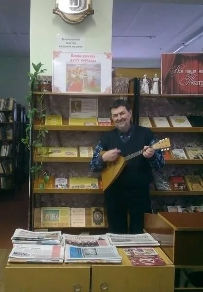 На встречу пришёл директор русского центра фольклора г.Казани, руководитель фольклорного объединения «Царёв город» г.Йошкар-Олы Александр Константинович Смирнов. «Народная песня – это целый мир. Надо ее ценить и беречь, сохранить всю эту красоту, передавая из поколения в поколение, как святое наследие»,- такими словами начал свой рассказ Александр Константинович об истории создания объединения, о направлениях его работы. С помощью видео материалов участники мероприятия смогли увидеть, как проходят экспедиции, как собирается уникальный материал для работы коллектива: записываются песни в исполнении жителей - сторожилов различных деревень, как фотографируется, измеряется старинная одежда, как потом, по этим образцам, вручную, шьются костюмы для выступлений. Собравшиеся смогли послушать как одну и ту же песню пели в разных деревнях, как пелись былины, солдатские, хороводные песни. Посмотрели отрывки из обрядовых спектаклей коллектива «Царёв город». Александр Константинович сказал, что основной задачей объединения является сохранение русской песни в первоначальном её звучании, потому что невозможно передать нотами многогранность человеческого голоса, а от этого и зависит характер песни. Рассказал об организации масленичных гуляний на Кокшаге, которые проводит объединение «Царёв город», о спектакле «Дело было в Петровке» и планах коллектива на ближайшее будущее. В библиотеке к этой встрече была подготовлена книжно- иллюстративная выставка «Песня русская – душа народная», материалы, рассказывающие об истории возникновения и развития русской песни, об исполнителях, работающих в этом жанре, а также сборники русских народных песен.