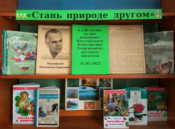 Дети ознакомились с выставкой книг Паустовского К.Г., где представлены его рассказы «Заячьи лапы», «Растрепанный воробей», «Золотой линь», «Барсучий нос», «Теплый хлеб» и другие.