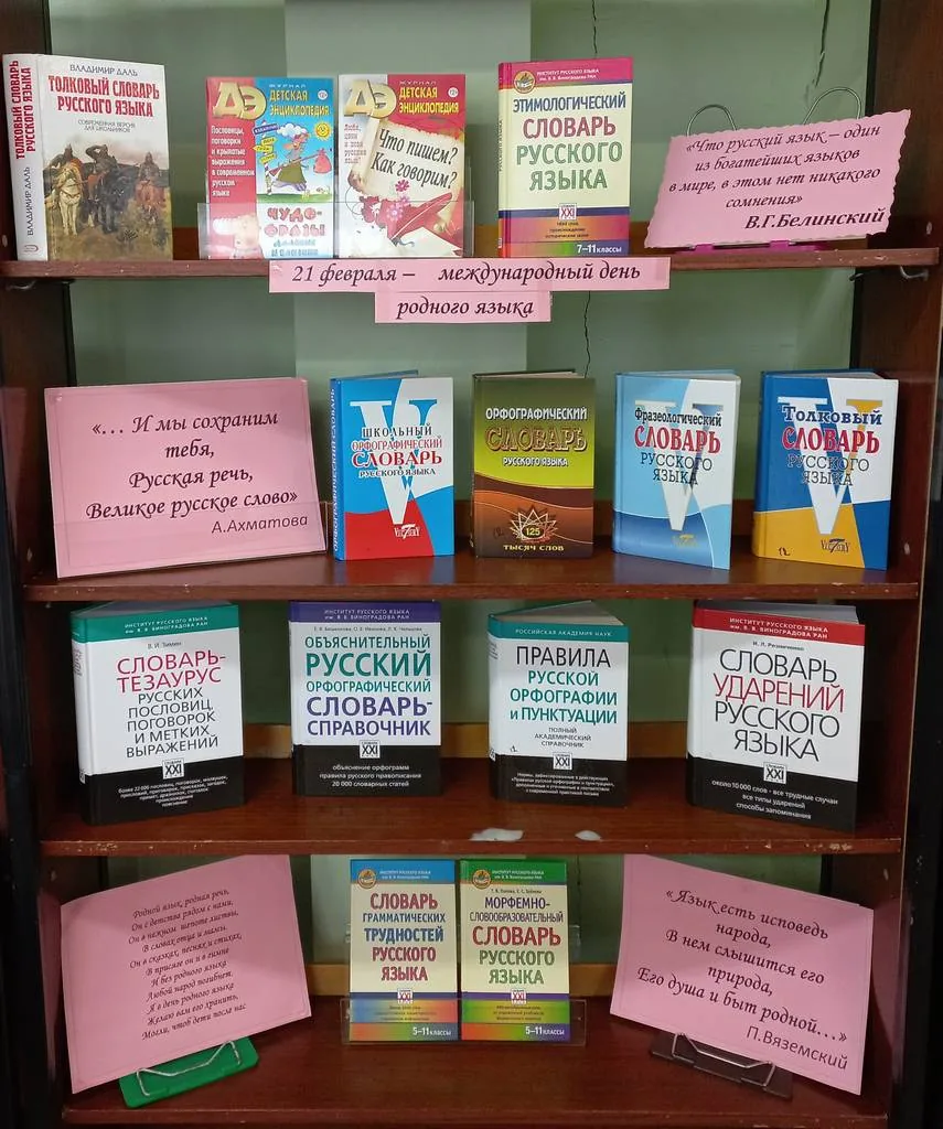 Ребятам 6 «Д» класса МБОУ СОШ№21 (кл.рук. – Липатникова Т.Н.) рассказали об огромном значении и влиянии русского языка при формировании личности гражданина России. Разобрали и обсудили смысл высказываний великих литераторов (Л.Н. Толстого, И.С. Тургенева и др.) о нашем общем родном языке. Ребята познакомились с новинками словарей, поступивших в фонд библиотеки в прошлом году (словарь ударений русского языка, объяснительный русский орфографический словарь-справочник, словарь тезаурус русских пословиц, словарь грамматических трудностей русского языка и т.д.) Не обошли стороной и «старый добрый» толковый словарь русского языка Владимира Даля. Библиотекарь объяснила, что для формирования грамотной речи именно эти издания необходимы учащемуся в первую очередь.