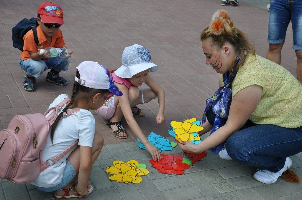 Игровая зона объединила маленьких любителей чтения, которые с большим удовольствием общались с Котом Леопольдом и его друзьями. Дети отвечали на занимательные вопросы о природе, о литературных героях, и с азартом выполняли игровые элементы: прыгали со скакалками, надували мыльные пузыри, рисовали на брусчатке.