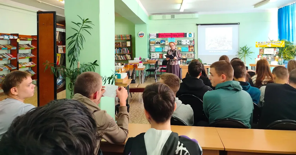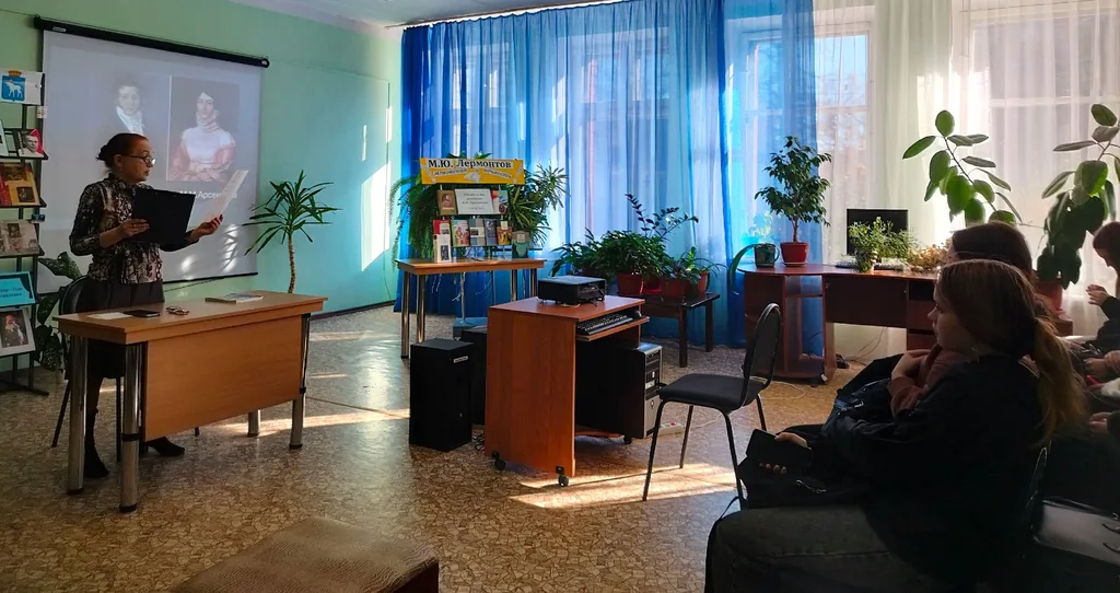 15 октября исполнилось 210 лет со дня рождения великого русского поэта М.Ю. Лермонтова. В Центральной библиотеке имени Р. С. Иванченко прошел урок классики «Читая Лермонтова строки», посвященный поэту. На мероприятие были приглашены обучающиеся в ГБ ПОУ РМЭ «Марийский политехнический техникум». Они узнали о непростой жизни Лермонтова: об учебе в Московском университете, военной службе на Кавказе, роковой дуэли, которая закончилась смертью поэта. На уроке звучало много стихов, написанных в разные периоды жизни поэта. Ребята читали стихотворения «Нищий», «Парус», «Валерик», «Смерть поэта»; смотрели видеоролики романсов на стихи Лермонтова – «Горные вершины» и «Нет, не тебя так пылко я люблю». Кроме того, ребята послушали вальс А. Хачатуряна к драме Лермонтова «Маскарад» и посмотрели отрывок из фильма «Герой нашего времени». К мероприятию была подготовлена книжная выставка «М.Ю. Лермонтов. Мгновения и вечность».