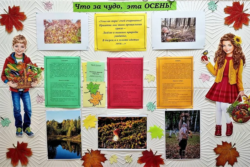 Для ребят подготовлен рекомендательный список литературы «Осенних красок хоровод», в котором представлены книги осенней тематики: «Почему осенью листопад?» Г. Граубина, «Год в лесу» И. Соколова-Микитова, сборник стихов русских поэтов о природе «Дивная пора», «Времена года. Стихи и рассказы о природе» и другие. Эти книги не только введут читателей в чудесный мир осени, но и научат их любить и понимать родную природу. Стенд украшают фотографии золотой осени.