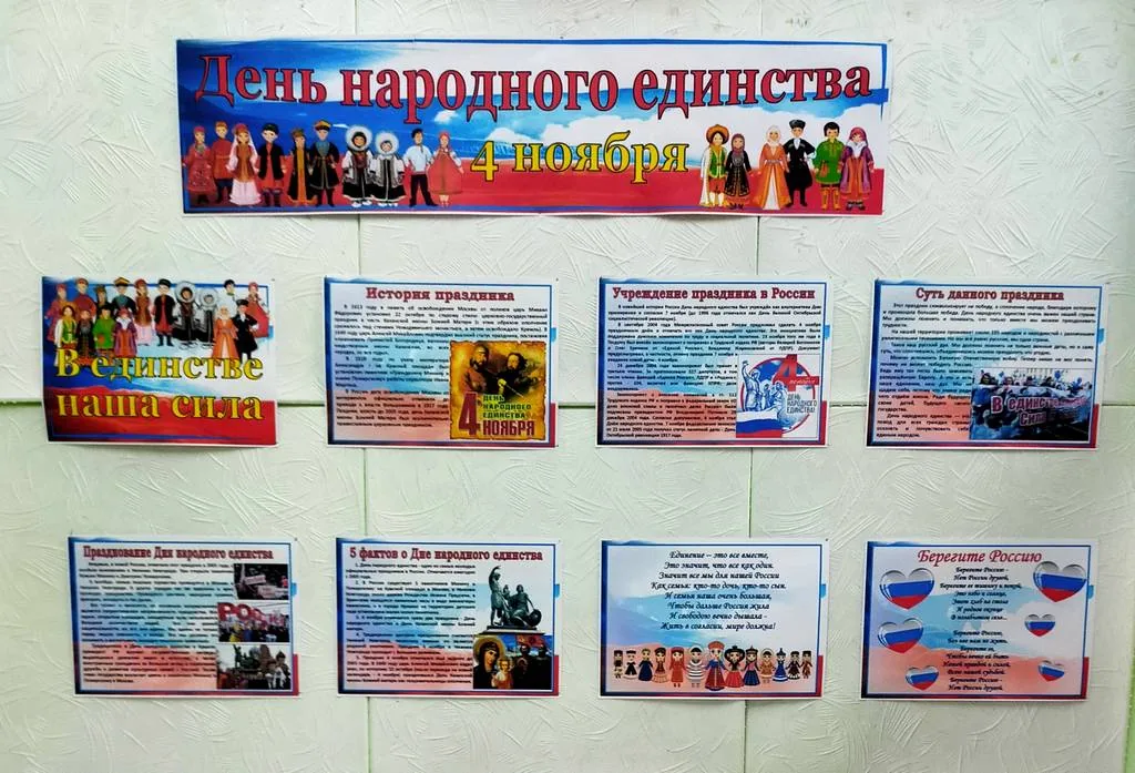 Из материалов стенда читатели узнают об истории праздника, о том, когда он был учрежден в России, что такое «единство», прочитают стихотворение «Берегите Россию».
