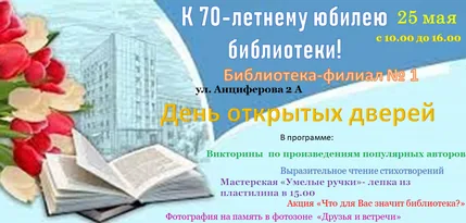 25 мая 2022 г. приглашаем всех желающих на День открытых дверей, приуроченный к 70- летнему юбилею библиотеки- филиала №1 (ул. Анциферова 2 А) с 10.00 до 16.00.