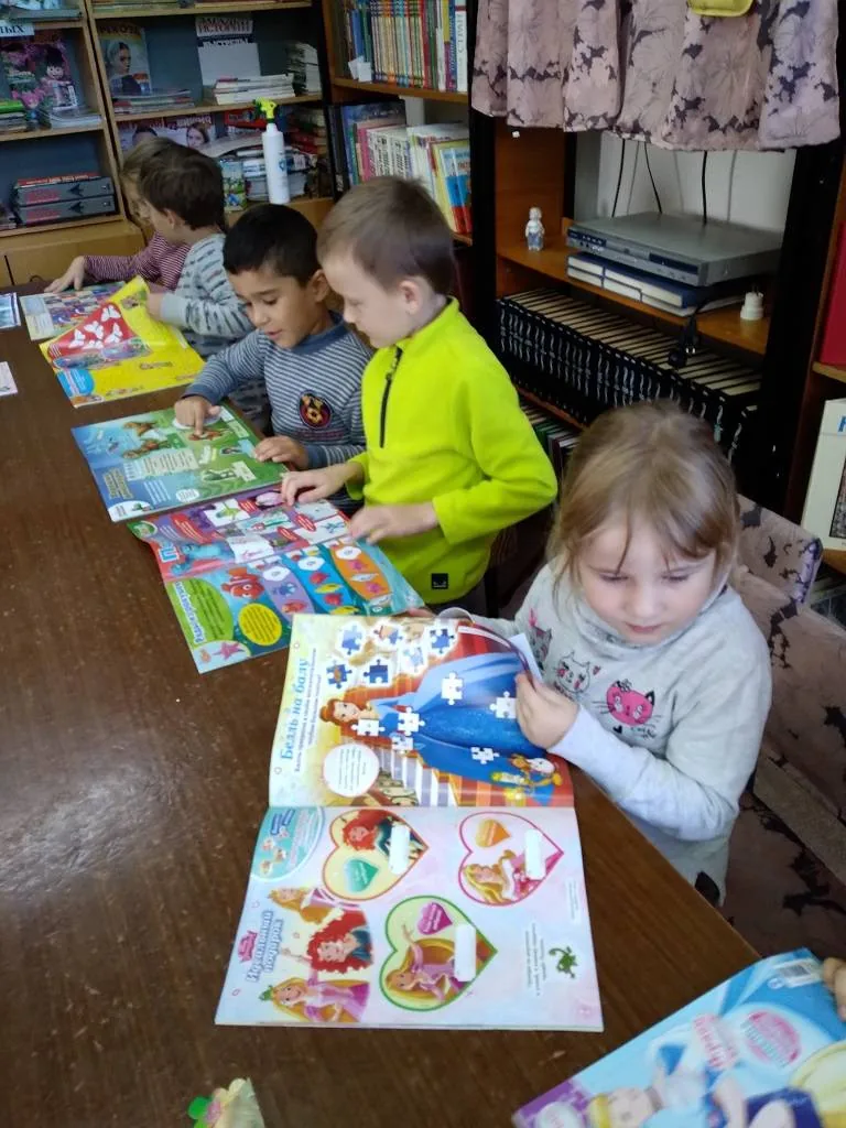 Дети справились с заданиями отлично, в итоге обе команды заработали одинаковое количество фишек и получили в награду красочное пособие «Рисуем пальчиками». В заключение ребята рассматривали журналы, проходя в них лабиринты и выполняя задания.