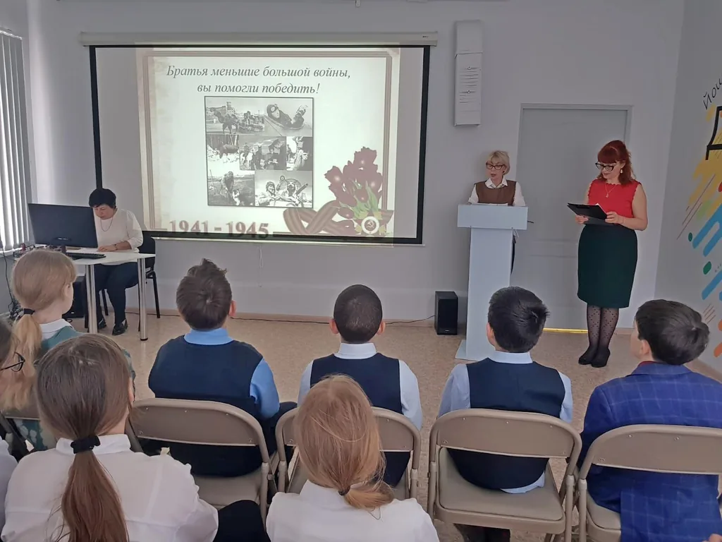 С большим вниманием школьники слушали рассказ ведущих о боевых подвигах «звериного и птичьего войска»: о судьбе двух собак Дике и Джульбарсе, о голубях Вити Черевичкина, о верблюдах Мишке и Машке и о котах, которые в блокадном Ленинграде стали настоящим спасением от крыс.