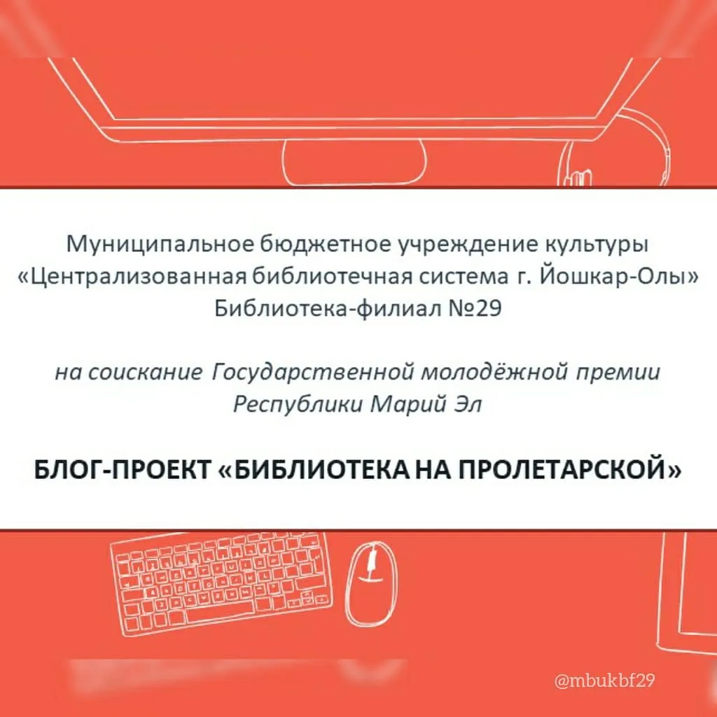 28 сентября в Национальной библиотеке имени С.Г. Чавайна состоялась презентация проектов на соискание Государственных молодёжных премий Республики Марий Эл в номинации "Литература, искусство и архитектура". Из 14 претендентов в данной номинации участвует заведующая библиотекой-филиалом №29 МБУК "Централизованная библиотечная система г. Йошкар-Олы" Акилбаева Ксения Ивановна с блог-проектом "Библиотека на Пролетарской".