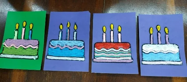 Но красивые торты можно не только испечь! Например, во время нашего занятия ребята готовили торты при помощи разноцветных ниток, бумаги и клея! Очень красивые и разные у всех торты получились! С таким тортом можно пойти в гости и подарить его!
