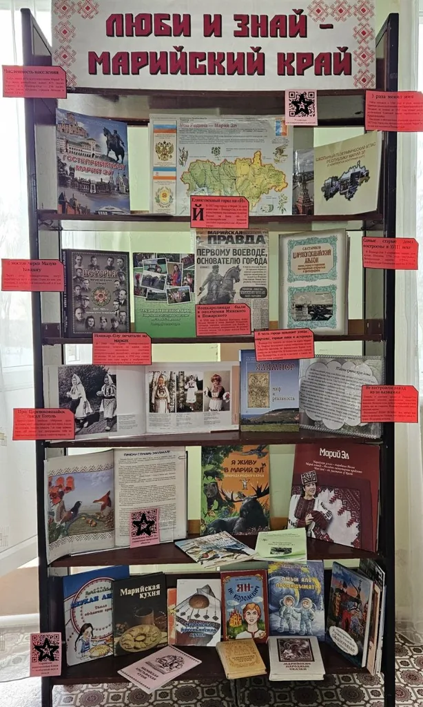 В библиотеке открылась интерактивная книжная выставка под названием "Люби и знай марийский край". Выставка посвящено богатой истории и культуре Марий Эл, а также выдающимся личностям, которые внесли значительный вклад в развитие региона и его столицы — Йошкар-Олы.