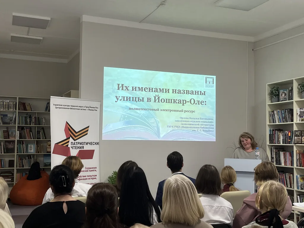 Затем Орлова Наталья Евгеньевна, заведующая отделом социально-экономической литературы Национальной библиотеки им. С. Г. Чавайна рассказала о полнотекстовом электронном ресурсе "Их именами названы улицы в Йошкар-Оле", который очень заинтересовал присутствующих студентов.