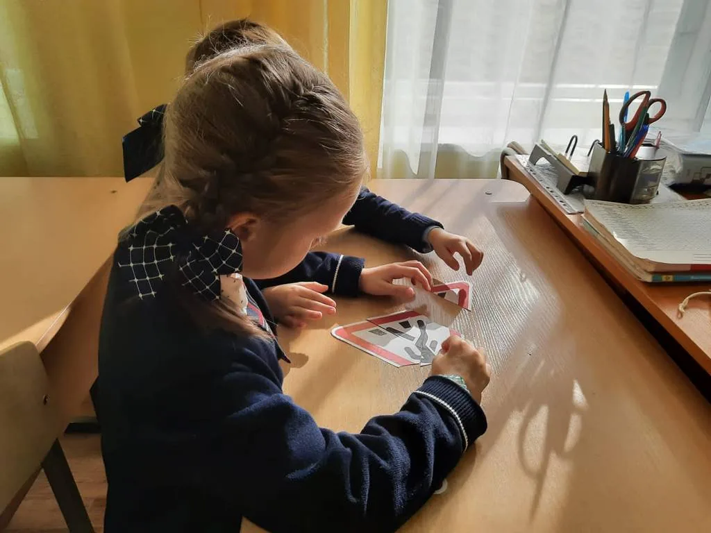 Кроме того, библиотекарь рассказала ребятам и Бабе-Яге, что есть на дорогах еще одни помощники – это дорожные знаки, которые бывают запрещающими, предупреждающими, информационно-указательными и предписывающими. Чтобы закрепить полученные знания, Баба-Яга провела с первоклассниками небольшое соревнование, кто быстрее из пазлов соберет дорожный знак и правильно объяснит, что он обозначает.