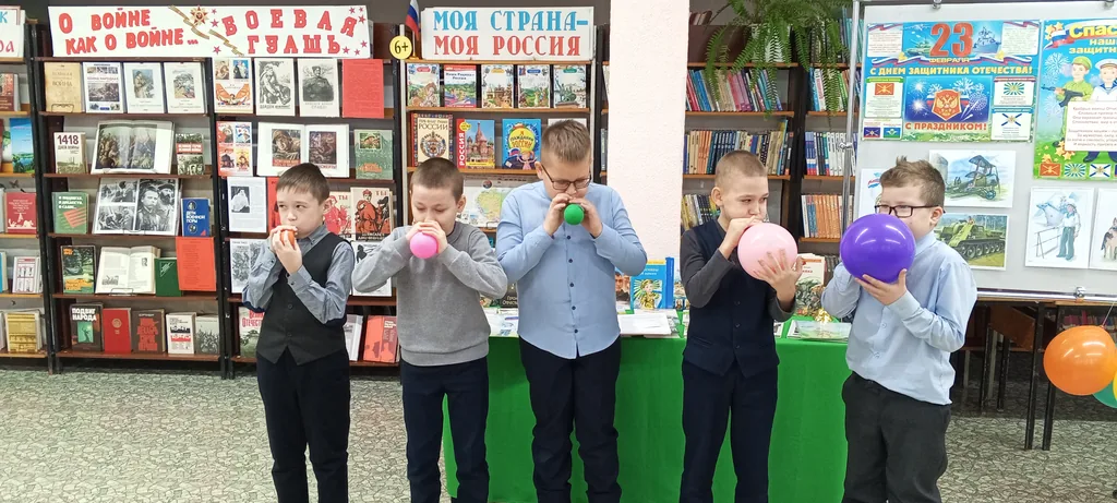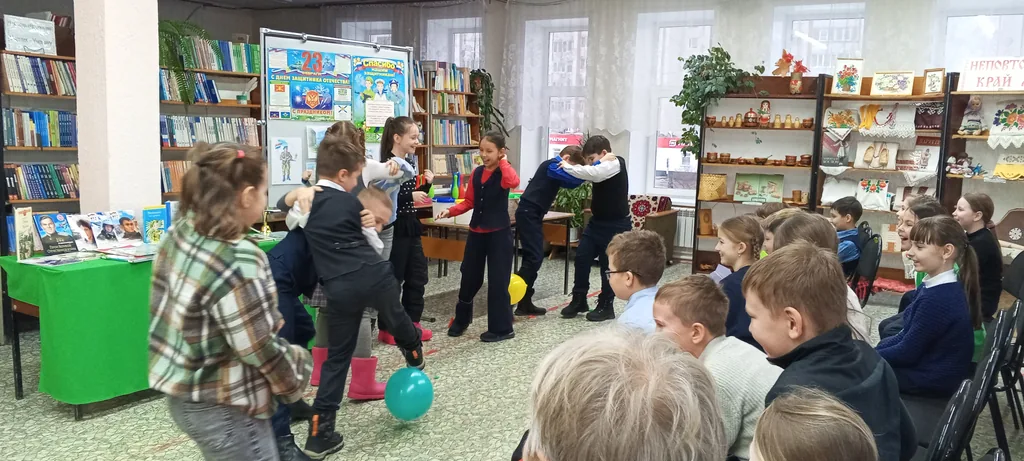 Девчонки и мальчишки с легкостью ответили на вопрос: «Почему армию называют Российской?», а на вопрос: «Почему армию называют родной?» ответ нашли, прослушав рассказ А. Митяева «Почему армия всем родная». Продолжилась Программа заданиями и соревнованиями. С первым заданием «Мы загадки разгадаем – все об армии узнаем» ребята быстро справились. Затем библиотекарь решила проверить, какие богатыри подрастают, проведя для детей различные конкурсы и игры: «Силу духа проверяем – шары быстро надуваем», «На скакалке мы скакали и в десантники попали», «Ведра с водой мы поднимаем, выносливость и силу моряков проверяем», «Мы сегодня не скучаем – самолеты запускаем», «Снова в бой танк наш мчится уничтожить цель стремится», «Зенитчик, ты ловкость свою покажи – снаряды, ты правильно распредели» «Пограничник на посту зорко смотрит в темноту»». В игре «Букву дружно называем, радиограмму прочитаем», назвав правильно все буквы, составили слово «Защитник».