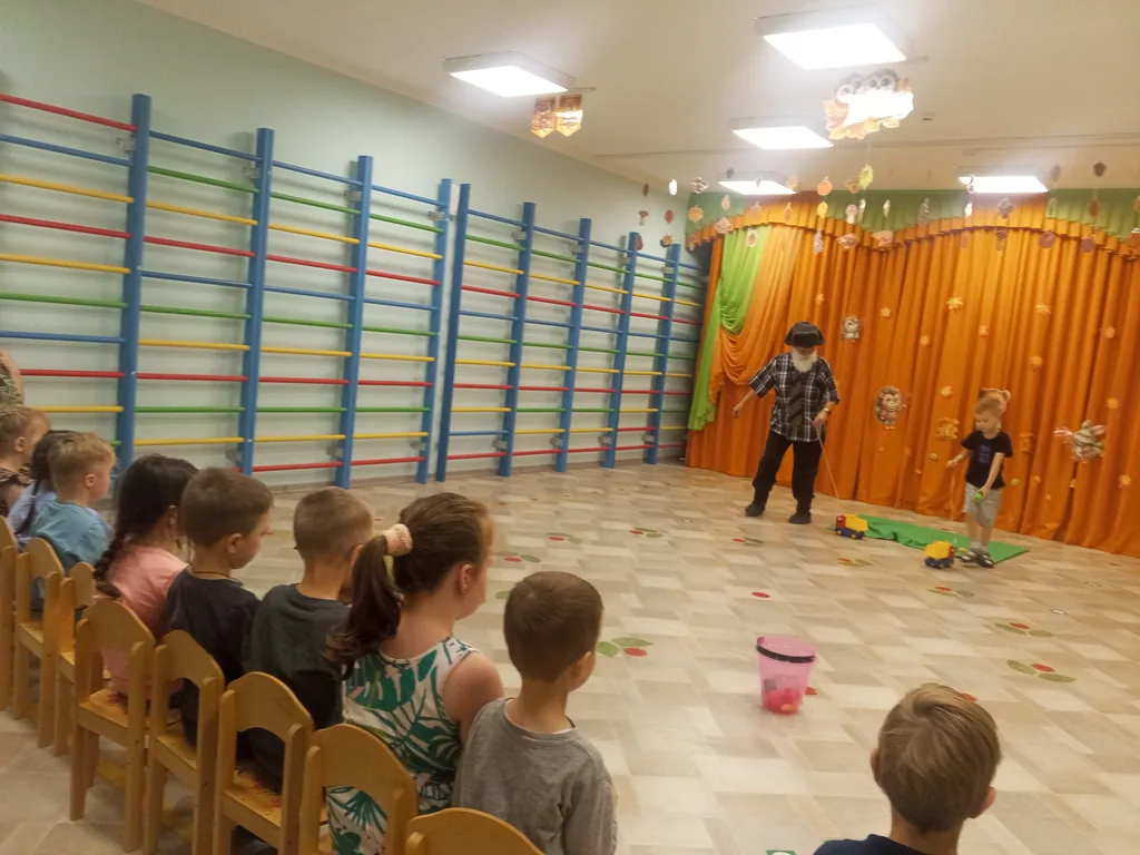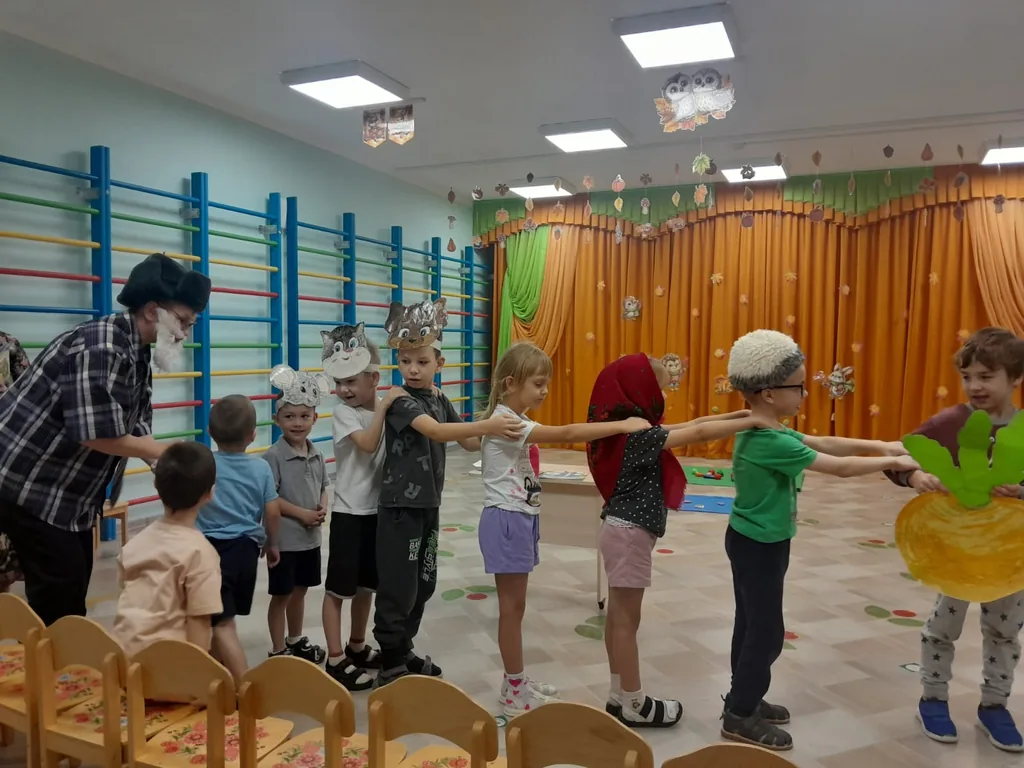 Бабушка и Дедушка узнали, читают ли взрослые детям книги, проверили, хорошо ли дети знают сказки, где Бабушка или Дедушка встречаются. Отгадав загадку про сказку «Репка», малыши стали главными героями этой сказки и разыграли сказку, затем немного потанцевали на музыкальной разминке «Эй, бабушки и дедушки!»