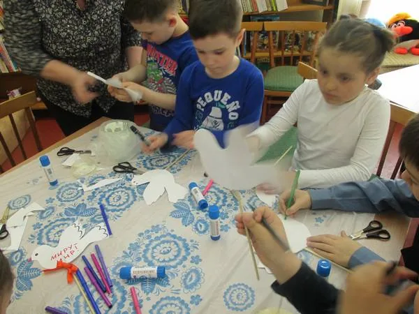После беседы библиотекарь провела с ребятами мастер-класс по изготовлению белого голубя из бумаги – символа Мира на земле. Ребята очень старались сделать его самостоятельно, чтобы на праздничном параде 9 мая гордо держать в руке над головой белого голубя - этот символ Мира, Добра и Счастья!