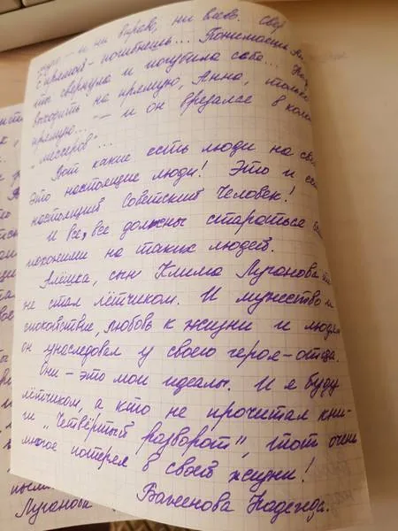 Они – это мои идеалы. И я буду лётчиком, а кто не прочитал, а кто не прочитал книги «Четвёртый разворот», тот очень многое потерял в совей жизни! Баженова Надежда».