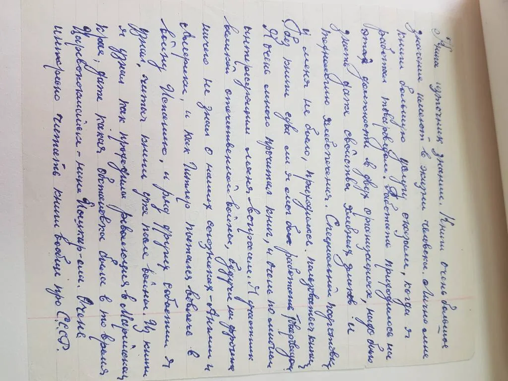 «Книга источник знания. Книги очень большое значение имеют в жизни человека. Лично мне книги большую услугу оказали, когда я работал товароведом. Работать приходилось на этой должности в двух организациях, надо было знать даже свойства хлебных злаков и технологию хлебопечения. Специальной подготовки у меня не было, приходилось пользоваться книгами, без книги едва ли я мог бы работать товароведом. Я очень прочитал книг, и очень по многим интересующим меня вопросам. Я участник Великой Отечественной войны, будучи на фронте ничего не знал о наших союзниках – Англии и Америке, и как Гитлер пытался вовлечь в войну Испанию. И ряд других событий я узнал читая книги уже после войны. Из книги я узнал как проходила революция в Марийском крае, даже какая обстановка была в то время в Царевококшайске – ныне Йошкар-Ола. Очень интересно читать книги вообще про СССР, тут можно узнать о промышленности, сельском хозяйстве, природе, где какая нация живет и их обычаи. Очень важно, даже можно сказать необходимым читать о работе Ленина, о его жизни, как об основателе первого в мире Социалистического государства. Книгу я делаю сравнение с человеком. Путём разговора с человеком узнаёшь то, о чем иногда не знаешь, и точно также можно узнать путём читки книг.»