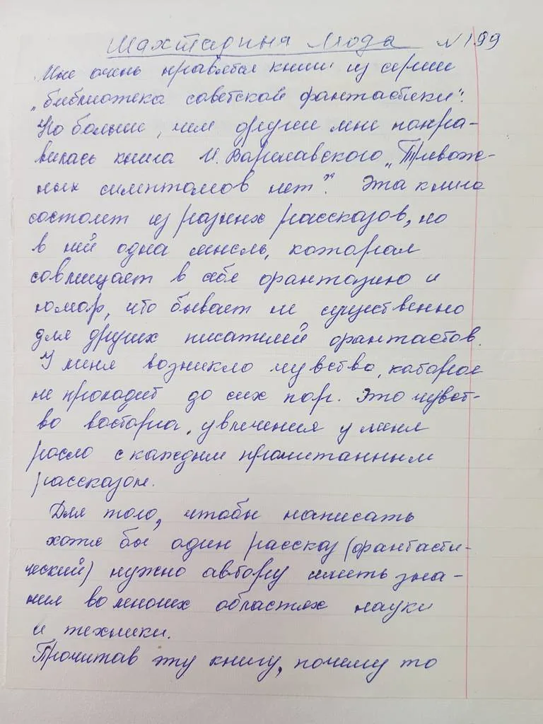 «Мне очень нравятся книги из серии «библиотека советской фантастики». Но больше, чем другие мне понравилась книга И. Варшавского «Тревожных симптомов нет». Эта книга состоит из разных рассказов, но в ней одна мысль, которая совмещает в себя фантазию и юмор, что бывает не существенно для других писателей фантастов. У меня возникло чувство, которое не проходит до сих пор. Это чувство восторга, увлечения к меня росло с каждым прочитанным рассказом.