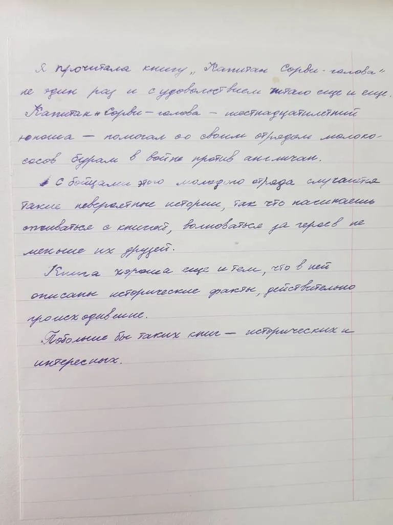 «Я прочитала книгу «Капитан Сорви-голова» не один раз и с удовольствием читаю еще и еще. Капитан Сорви-голова – шестнадцатилетний юноша – помогал со своим отрядом молокососов бурам в войне против англичан.