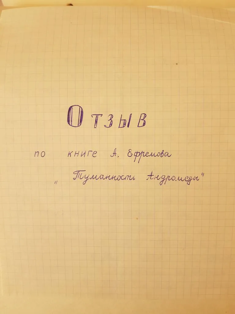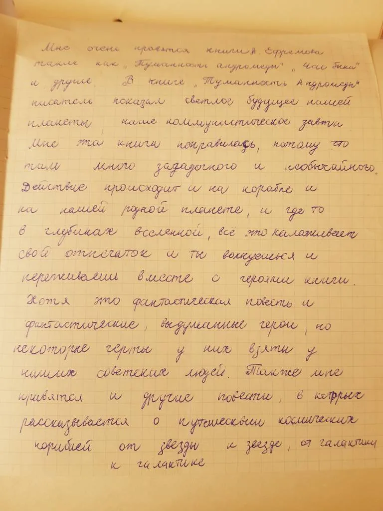 «Мне очень нравятся книги А. Ефремова такие как «Туманность Андромеды», «Час быка» и другие. В книге «Туманность Андромеды» писатель показал светлое будущее нашей планеты, наше коммунистическое завтра. Мне эта книга понравилась, потому что там много загадочного и необычного. Действие происходит и на корабле, и на нашей родной планете, и где-то в глубинах вселенной, все это накладывает свой отпечаток, и ты волнуешься и переживаешь вместе с героями книги.