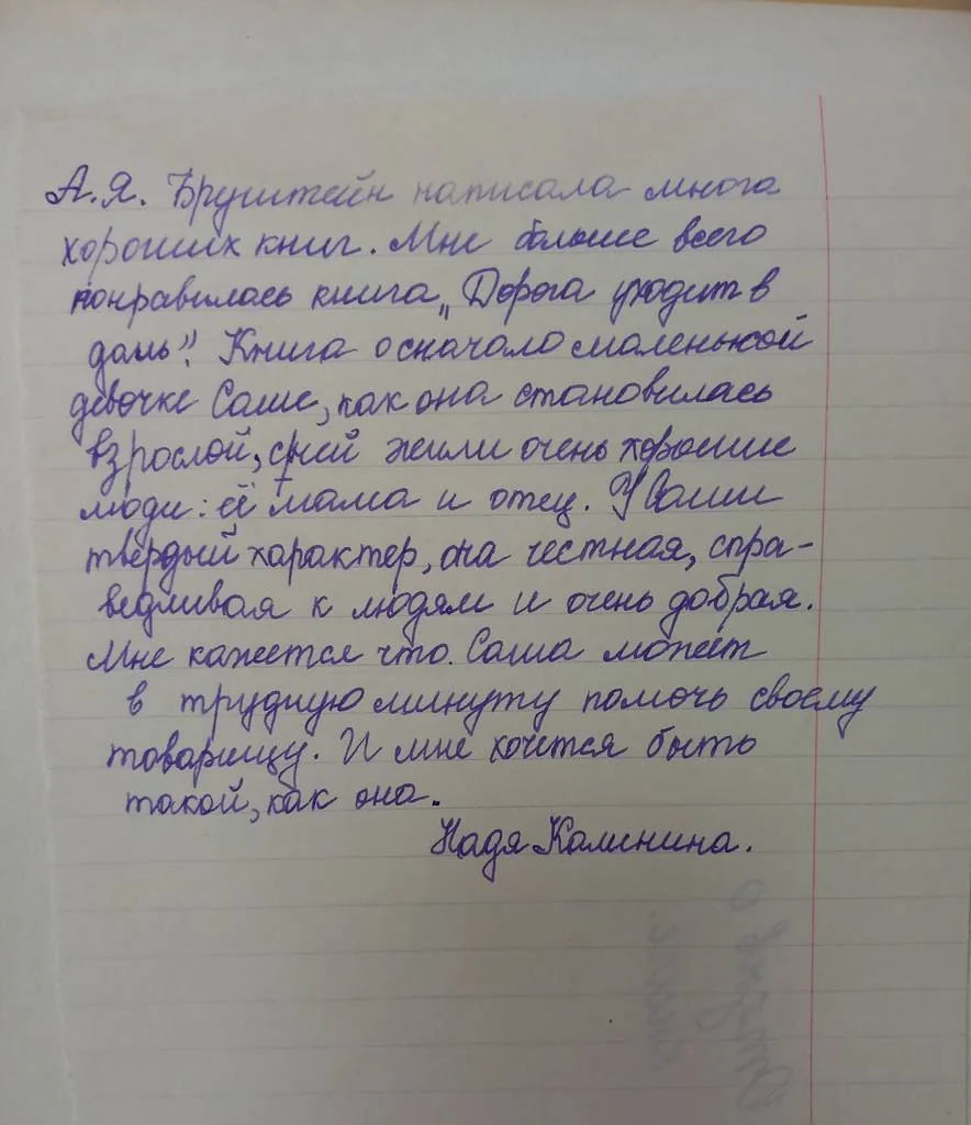 «А. Я. Бруштейн написала много хороших книг. Мне больше всего понравилась книга «Дорога уходит в даль». Книга о маленькой девочке Саше, как она становилась взрослой, с ней жили очень хорошие люди: ее мама и отец. У Саши твердый характер, она честная, справедливая к людям и очень добрая. Мне кажется, что Саша может в трудную минуту помочь своему товарищу. И мне хочется быть такой, как она.»
