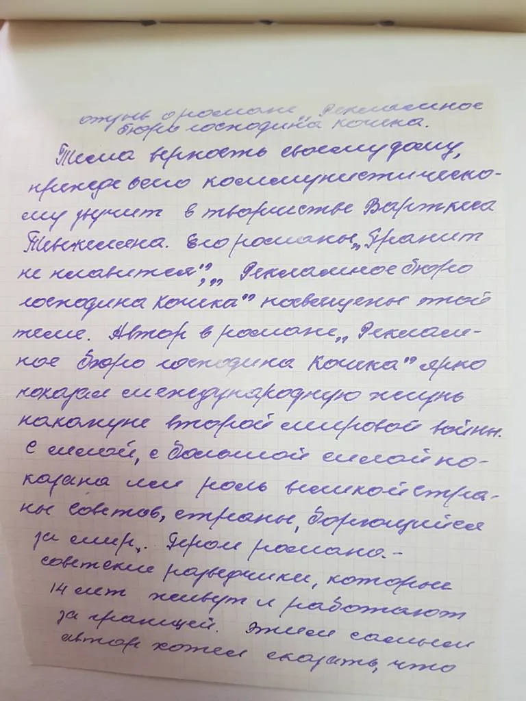 «Тема верности своему дому, прежде всего коммунистическому звучит в творчестве Варткеса Тевекеляна. Его романы «Гранит не плавится», «Рекламное бюро господина Кочека» посвящены этой теме. Автор в романе «Рекламное бюро господина Кочека» ярко показал международную жизнь накануне второй мировой войны. С силой, большой силой показана им роль великой страны Советов, страны, борющейся за мир. Герои романа – советские разведчики, которые 14 лет живут и работают за границей. Этим самым автор хотел сказать, что Советский Союз всегда борется за гуманизм, за мир, за счастье людей на всей планете.»