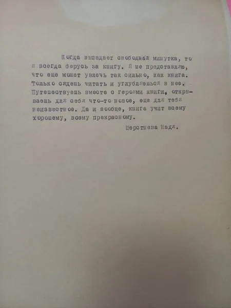 «Когда выпадает свободная минутка, то я всегда берусь за книгу. Я не представляю, что еще может увлечь так сильно, как книга. Только сядешь читать и углубляешься в нее. Путешествуешь вместе с героями книги, открываешь для себя что-то новое, книга учит всему хорошему, всему прекрасному. Шерстнева Надя.»