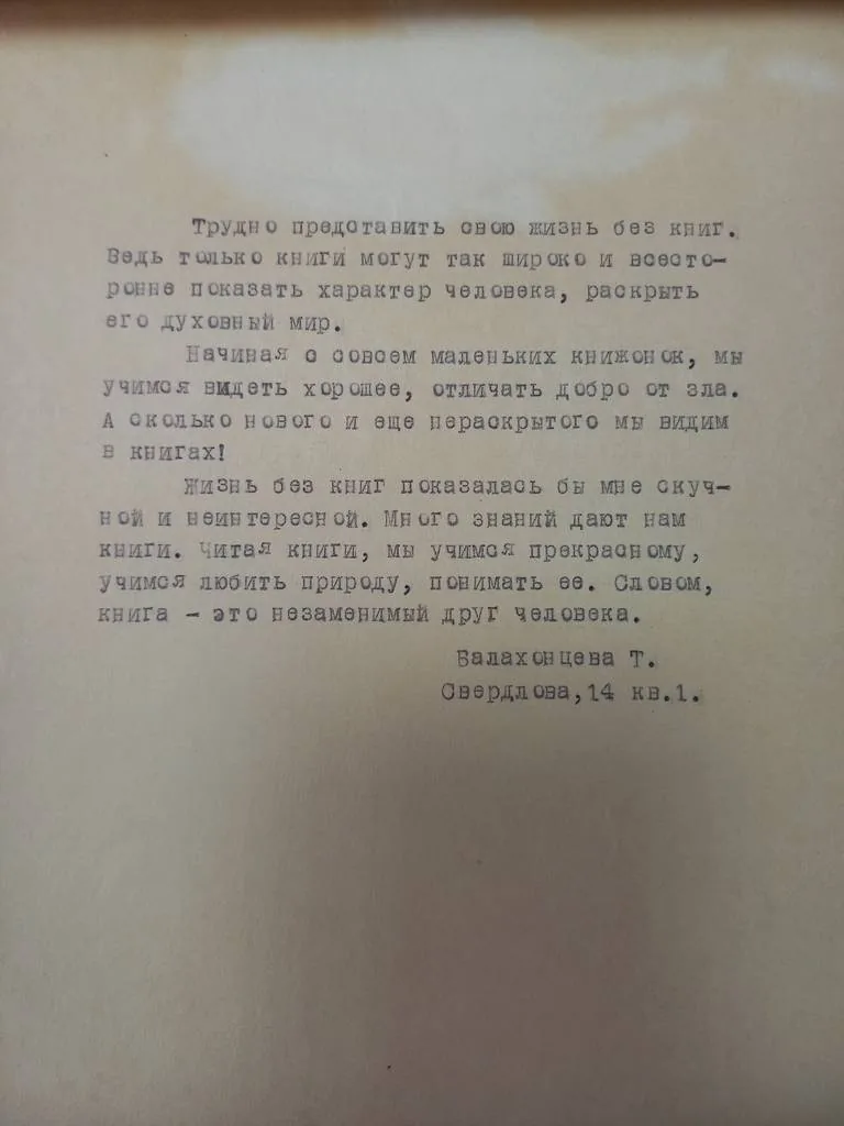 Начиная с совсем маленьких книжонок, мы учимся видеть хорошее, отличать добро от зла. А сколько нового и еще нераскрытого мы видим в книгах. Жизнь без книг показалась бы мне скучной и неинтересной. Много знаний дают нам книги, мы учимся прекрасному, учимся любить природу, понимать ее. Словом, книга – это незаменимый друг человека. Валахонцева Т.»