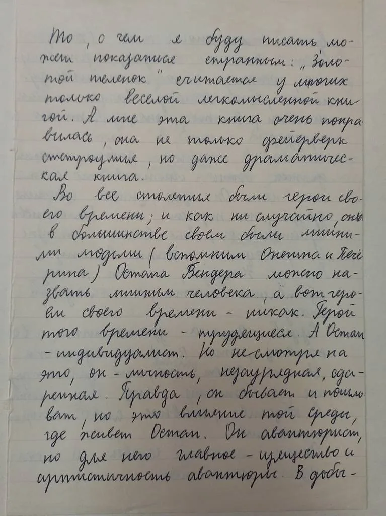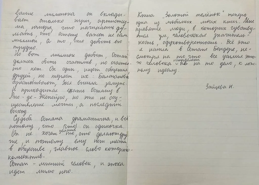 Книга «Золотой телёнок» теперь одна из любимых моих книг. Мне нравятся люди, в которых чувствуется ум, человеческая значительность, одухотворенность. Все это я нашла в Остапе Бендере, не смотря на то, что все усилия этого человека направлены не на то дело, к ложному идеалу. Зайцева Н.»