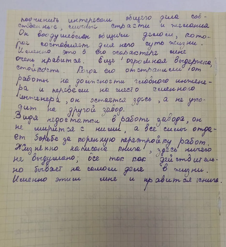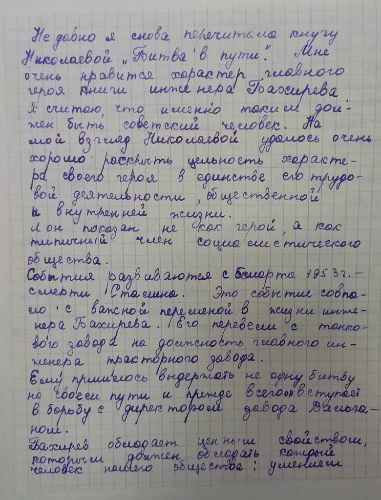 «Недавно я снова перечитала книгу Николаевой «Битва в пути». Мне очень нравится характер главного героя книги инженера Бахирева. Я считаю, что именно таким должен быть советский человек. На мой взгляд Николаевой удалось очень хорошо раскрыть цельность характера своего героя в единстве его трудовой деятельности, общественной и внутренней жизни.