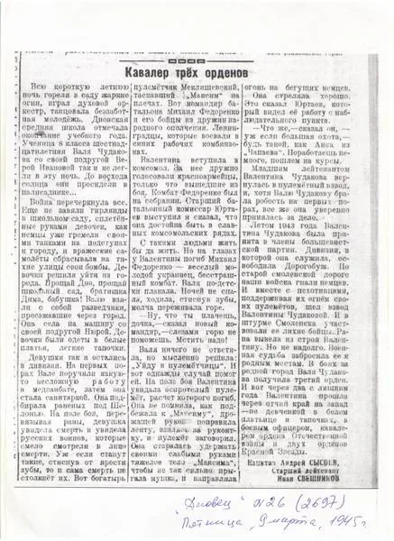 Валентина Васильевна Чудакова умерла 14 июля 1989 г. Ей было всего шестьдесят четыре года. Она ушла с застрявшим под сердцем вражеским осколком, и пробитыми на войне лёгкими.