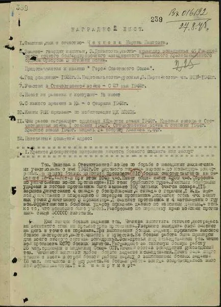 15 мая 1946 года указом Президиума Верховного Совета СССР за образцовое выполнение боевых заданий командования и проявленные мужество и героизм в боях с немецко-фашистскими захватчиками гвардии капитану Марине Павловне Чечневой было присвоено звание Героя Советского Союза.