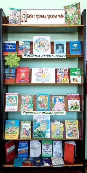 Наша выставка имеет три раздела. Раздел «Ребёнок имеет право» представляет книги, которые в увлекательной форме рассказывает детям о правовой жизни России, о законах, правах и обязанностях. Тут представлены законодательные документы, методические пособия, которые защищают права детей. Имеется основной закон России – Конституция, Конвенция о правах ребёнка и др. В разделе «Герои книг имеют право» можно определить, кто из литературных героев был лишён прав: «Маугли», «Три поросёнка», «Доктор Айболит», «Красная шапочка», «Золушка», «Приключения Буратино» и др. В третьем разделе можно познакомиться с разными кодексами России, декларациями и правами.