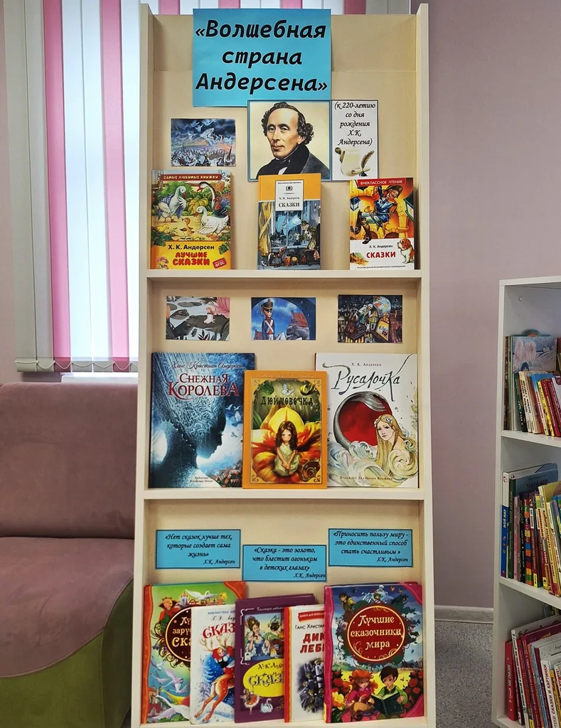 В модельной библиотеке-филиале №1 для детей дошкольного и младшего школьного возраста подготовлена книжная выставка «Волшебная страна Андерсена», посвященная 220-летию со дня рождения великого сказочника.