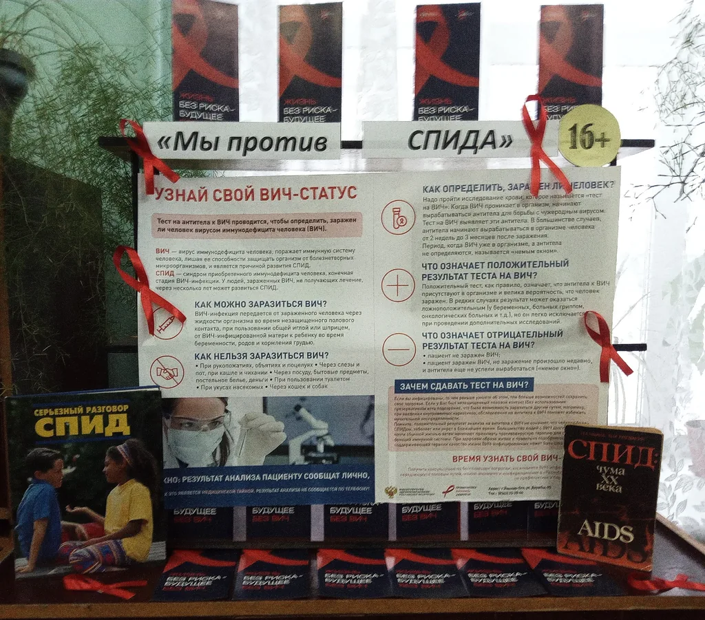 30 ноября, в рамках Всемирного дня борьбы со СПИДом в библиотеке - филиале № 29 открылась книжно - иллюстративная выставка "Мы против СПИДа". На выставке размещены информационно - просветительские материалы, рассказывающие об истории заболевания, о симптомах и способах СПИДа, о способах передачи ВИЧ-инфекции, а также о профилактике СПИДа. Читателям библиотеки предоставлены буклеты "Жизнь без риска - будущее без ВИЧ".