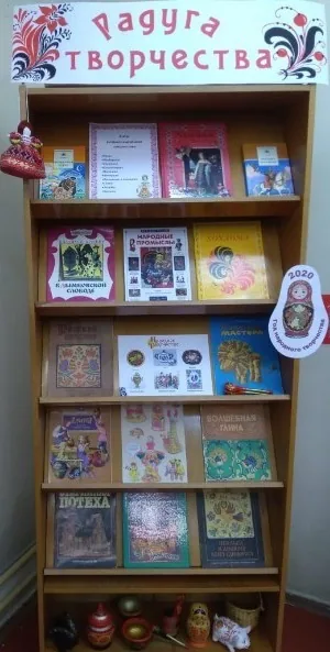 В младшем отделе Центральной детской библиотеки оформлена годовая книжно-иллюстративная выставка «Радуга творчества» к 2020 году – Году Народного творчества в России. На ней представлены книги, которые знакомят читателей с разными видами народного творчества.