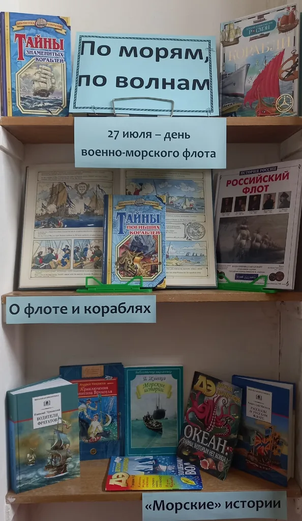 В библиотеке-филиале №27 работает книжно-предметная выставка «По морям, по волнам», посвященная дню военно-морского флота. Выставка состоит из двух разделов: «О флоте и кораблях» и «Морские истории».