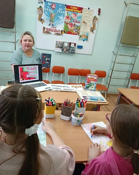 В ходе мероприятия Секретарева Елена Юрьевна рассказала детям о подвиге советского народа в Великой Отечественной войне. Показала книги и иллюстрации о Победе . С помощью цветных карандашей, фломастеров и акварельных красок ребята все дружно нарисовали рисунки о Победе.