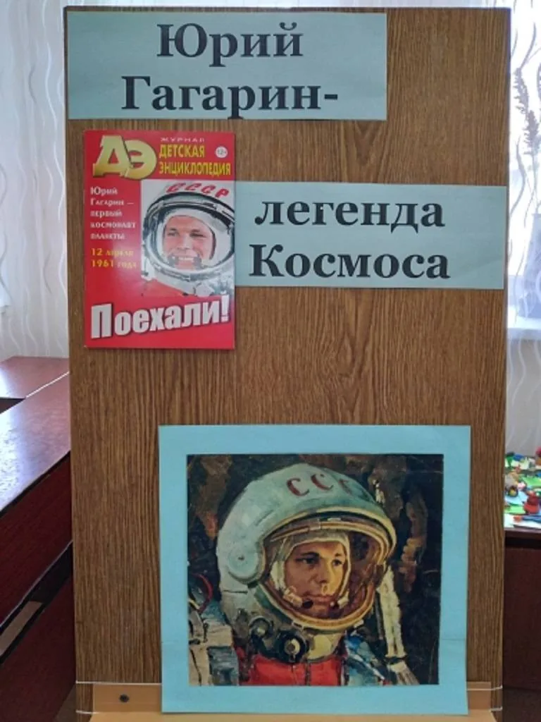 У выставки «Юрий Гагарин- легенда космоса» дети отвечали на вопросы викторины и знакомились с книгами на заданную тему
